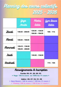 - yoga et gym douce : 12€ le cours // 120€ les 11 cours